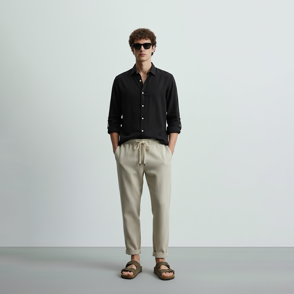 Diferenciais: Cós com cordão e detalhe de barra dobrada.